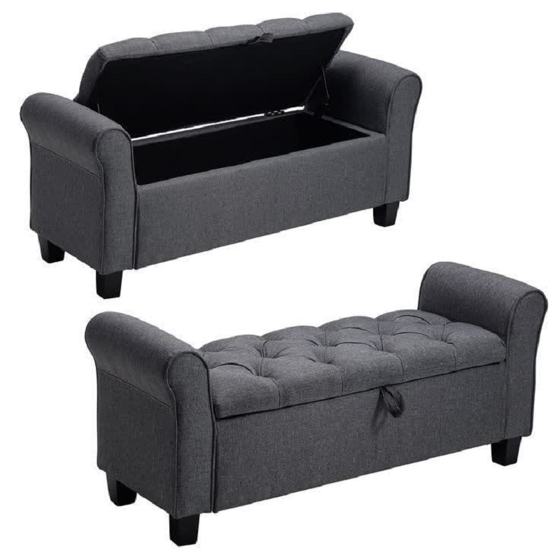 نیمکت جادار لمسهشده خاکستری با درب چستردار و پایههای چوبی؛ مناسب راهرو، اتاق خواب و ورودی خانه — نشیمن راحت و فضای ذخیرهسازی کاربردی